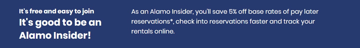 האם אתה רוצה לחסוך אפילו יותר כשאתה משתמש באחד משירותי השכרת הרכב של ALAMO? לאחר מכן, עליך להצטרף לאחת מתוכנית התגמולים כדי לקבל פיצוי על נאמנותך. אתה יכול לחסוך לפחות 5% הנחה על תעריפי הבסיס או שאתה יכול לקבל הנחות נוספות ושיעורי עמלות גבוהים בתור שותף. בדוק תמיד את קטגוריית המבצעים באתר הרשמי כדי לחסוך יותר מ-10% הנחה על רכבים מסוימים. קנה במהלך אירועי המכירות המיוחדים כמו בלאק פריידי, סייבר מאנדיי, מכירות יום הרווקים וכן הלאה כדי לחסוך עד 65% הנחה על השכרת הרכב שלך. ואל תשכחו להירשם לניוזלטר כדי לקבל הנחות נוספות על הזמנות נוספות שנעשו עם ALAMO.